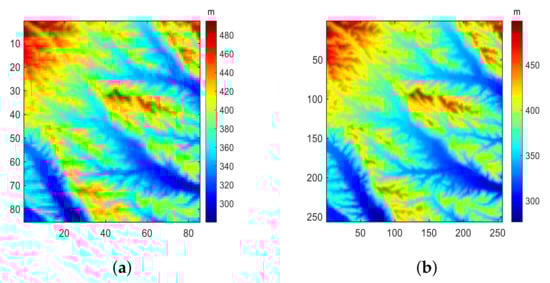 To evaluate the effect of low-resolution DEM matching the high-resolution polarization SAR data, the proposed method was used to analyze the situation when tie-points had the resolutions of 90 m and 30 m, as shown in Figure 15. The inversion results corresponding to the two resolutions are shown in Figure 16, where it can be seen that the higher the resolution of the tie-point matrix, the higher the similarity between the PolSAR-derived DEM and InSAR-derived DEM.