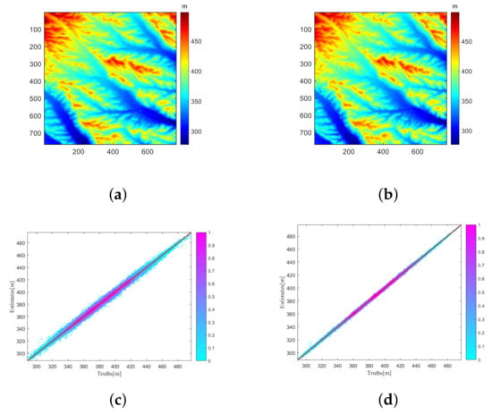 First, the method proposed in [11] was used to generate the tie-point matrix and the C-band InSAR DEM presented in Figure 3a was downsampled to the resolution of 640 m, which was the same as the resolution in [11], as shown in Figure 6. Meanwhile, for better performance analysis, the DEM in Figure 3a is repeated in Figure 6a and a 5 × 5 boxcar filter is used to filter the L-band PolSAR data.