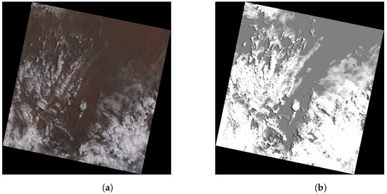 The biome dataset consists of 96 scenes divided into 8 biomes. The scene size is 185 km by 180 km, and each scene contains 11 multispectral bands with a resolution of 30 m per pixel (except bands 8, 10, and 11, which are not used in this work). Manually annotated cloud coverage is stored as a cloud validation mask. The cloud validation mask is an image whose pixel values contain information about the level (or class) of cloudiness, interpreted using the following Table 1. The example of the scene image (natural color composition) from the biome dataset can be found in Figure 1a, with its respective cloud mask in Figure 1b.