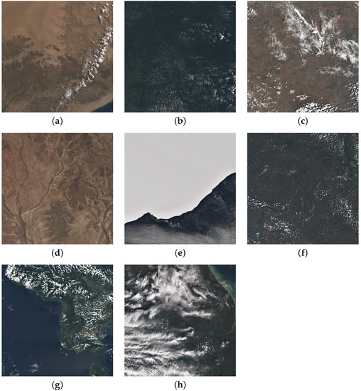 For the purpose of this study, the Landsat 8 Cloud Cover Assessment Validation data ( biome dataset) [35] was used. The biome dataset offers a balanced cloud distribution and diverse sets of land and water cover, which makes it a suitable source of data for the proposed CNN-based classification model. The biome dataset was acquired by the Landsat 8 Operational Land Imager (OLI) and Thermal Infrared Sensor (TIRS) [36]. Furthermore, data are orthorectified and corrected for terrain relief using Level-1T processing [37].