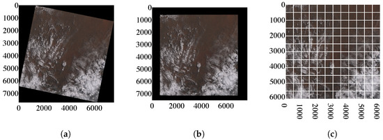 The image patch for each scene is a natural color composite from the combination of bands B4 (red), B3 (green), and B2 (blue). Values in patch images are re-scaled from the range 0–65,535 to 0–255 using a MinMax normalization. Patch images in the biome dataset are georeferenced. The orbit path of the Landsat-8 does not go straight from south to north. The scene acquisition follows the orbit path of the satellite. Therefore the image appears to be rotated or tilted, like in Figure 4a. Redundant georeferencing information can be neglected when detecting clouds from satellite images. Next, the black (no-data) parts of the image need to be removed. The removal of the black parts consists of two steps. First, the image is rotated, so the actual image data are parallel to the whole scene image, as shown in Figure 4b. The rotation is using a nearest-neighbor interpolation method. Then, the image is cropped to lower resolution (from approx. 8000 × 8000 to approx. 6400 × 6400), so only image data are preserved, as illustrated in Figure 4c.
