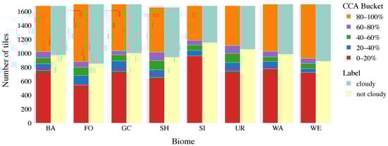 Distribution of the tiles and its CCA values per biome for the full biome dataset. Tiles with are categorized as cloudy and the rest are categorized as not cloudy tiles.