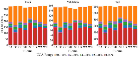 Distribution of the tiles and its CCA values per biome for the training, validation and testing dataset.