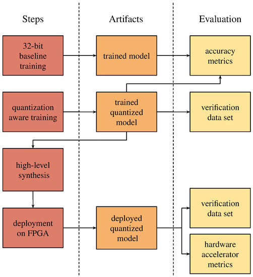 The pipeline used to create the hardware accelerated CNN consists of the following steps. First, the baseline floating point model is trained and evaluated to observe standard metrics such as accuracy, recall, precision and F1 score. Next, QAT is used to train the quantized model, which is evaluated in the same way as the baseline model. In addition to this, a smaller verification dataset with the same distribution of tiles in the respective cloud cover ranges is created and consists of 380 tiles. Per-tile evaluation is performed on this dataset and resulting logits from the last layer are saved for the model verification deployed on FPGA. The quantized model is exported to ONNX format [52] and transformed to high-level synthesis (HLS) code using the FINN framework. The model is then synthesized using Vivado Design Tools from Xilinx and the resulting bit file is deployed to FPGA. Evaluation of deployed model with focus on observing hardware accelerator attributes is performed. Per-tile evaluation on the verification dataset is performed and resulting logits are statistically compared using t-test to measure model distortion caused by the deployment of the model on the edge. Workflow is summarized in the scheme displayed in Figure 8.