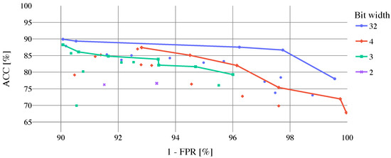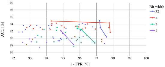 Results of cloud coverage classification using the biome dataset without Snow/Ice biome to train, validate and test the proposed CNN are shown in Table 6. In the upper part of the table, best-performed models selected by ACC are presented. As can be noticed, in comparison with previous models trained by the full biome dataset the classification performance was improved (–, –). In the bottom part of Table 6, top models selected by FPR are shown (models are selected from the top 10 models sorted by ACC). In case of the 32 and 2-bit width models, there is no change in performance. However, FPR for 4 and 3-bit width models is lower, whereas 4-bit model outperforms the 32-bit width one. For a better illustration, the dependence of model ACC on FPR can be seen in Figure 11, where optimal solutions are highlighted by Pareto fronts.