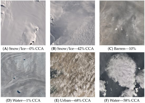Regarding the previously mentioned results, all biomes, to a certain degree, suffer from the cloud-like features problem. An example is given in Figure 10, where six misclassified cases are presented. The first example of the Snow/Ice biome (A) has , yet the snow in the image was misclassified to a cloud. The second example of Snow/Ice biome (B) with merged cloud with turbid snow currents. Next, the smooth hilly terrain of the Barren biome (C) stretches the features of thinly dispersed clouds. This resulted in the falsely positive image, however, the CCA is in reality. Similarly, the Water biome example (D) with was misclassified due to the wavy, serpentine features of the shallow water. The last two examples (E, F) in Figure 10 represent the case near the threshold (). Hereabouts, a small number of cloud pixels may flip the CCA over the threshold boundary. In addition, the precise value of the CCA for each tile may be softly different from the CCA label [35,37].
