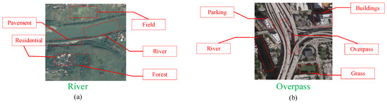 Scene labels (shown in green font) and object labels (shown in red font) for remote-sensing images. (a) Scene labels: River. Object labels: Field, Forest, Residential, Pavement. (b) Scene labels: Overpass. Object labels: Buildings, Grass, Parking, River.