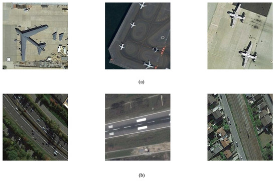 Remote-sensing scene images. (a) High intra-class differences: airplane. (b) High inter-class similarities: highway, runway, railway.