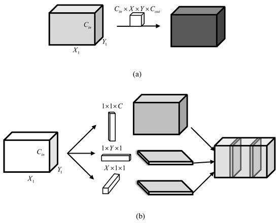 As shown in Figure 5b, the dimension-wise convolution adopts three different scale convolutions with dimension , dimension and dimension to convolute along the length, width and channel direction, respectively, and then integrates these features of three-dimensional convolution. Compared with traditional convolution, the proposed dimension-wise convolution has obvious advantages in the number of parameters and the amount of computation. The comparison of the number of parameters and computation amount between the traditional convolution and the proposed dimension-wise convolution is analyzed as follows.