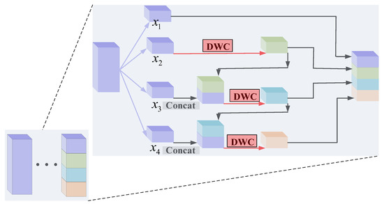 In the hierarchical-wise convolution fusion module B, which is shown in Figure 7, only the second set of input features can be mapped directly to the next layer. The first group of input features first extracts features by dimension-wise convolution (DWC) to obtain and then divides the output features into two routes; one is mapped to the next layer, the other and the third group of input features to channel concatenation to obtain . After concatenation, the features are extracted by dimension-wise convolution. Then, the features are divided into two routes; one is mapped to the next layer, the other and the fourth group of features to channel concatenation to obtain . After concatenation, the features are extracted by dimension-wise convolution. Finally, the features are mapped to the next layer. The whole process can be represented as