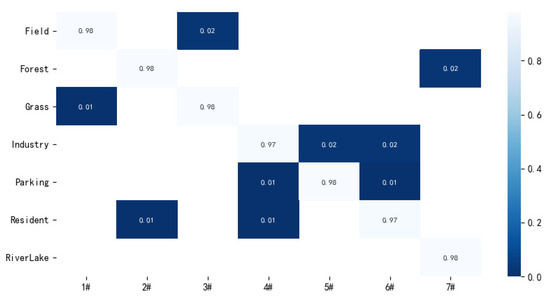 The confusion matrix of the proposed method on the RSSCN dataset is shown in Figure 11. From Figure 11, it can be seen that although the proposed method does not fully recognize any scene image in this dataset, the accuracy of all scene images is over 97%, and the proposed method still achieves good results.