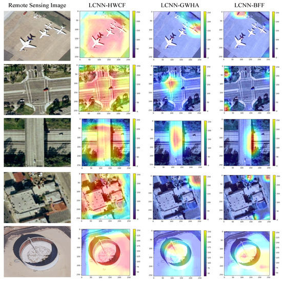 In order to more intuitively show the advantages of the proposed method, a variety of visualization methods are adopted to visually analyze the proposed method. Firstly, a gradient-weighted class activation map (Grad CAM) is utilized to visualize the proposed method. In order to prove that the proposed method can extract the significant features of remote-sensing images effectively, two methods, LCNN-BFF [32] and LCNN-GWHA [55], which have good classification performance, are chosen in the experiment for visual analysis on the UCM datasets. The visualization results are shown in Figure 14. The highlighted areas in the gradient-weighted class activation graph indicate how much attention is paid to the scene by the proposed method, while red highlighted areas indicate a higher degree of attention to the scene. From Figure 14, it can be seen that compared with LCNN-BFF [32] and LCNN-GWHA [55], the proposed method can extract scene features more effectively and have a better semantic coverage for the scene area.