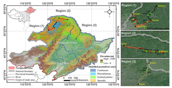 The topography of Northeast China and location of field monitoring sites (source of permafrost zones [54]).