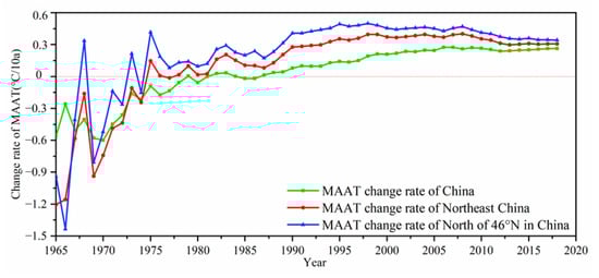 Figure 3 shows the change rate of MAAT of national meteorological stations in different regions of China from 1960 to 2019. The change of MAAT in each year means the MAAT change in the time series from 1960 to the specific year. The representativeness of the change rate in a shorter time is slightly lower, therefore, the change rate of MAAT from 1961 to 1964 is not shown. The change rate of MAAT showed an overall increasing trend with time, and the warming rate decreased after 2006. In China, it was higher than 0 since 1987, and the warming effect in the middle and high latitudes showed earlier. Since 1975, the change rate of MAAT in the study area was higher than the national average; specifically, in the middle and high latitudes of the study area, it was higher during the same period.