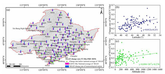 The change rate of MAAT for 109 national meteorological stations in the study area from 1960 to 2019 was greater than 0 (in Figure 4a), therefore, it was a warming trend. Compared with the average change rate of MAAT for China during the same period, the stations with a higher change rate of MAAT were mainly concentrated in the north of 46°N of the study area, except for Tahe, Hegang and Fujin. The effect of air temperature rising was amplified in middle and high latitudes. With the increase in altitude and latitude, the change rate had an increasing trend (Figure 4b,c). However, the meteorological stations in the middle and high latitudes were relatively few and unevenly distributed (Figure 4a), therefore, the results may be somewhat one-sided.