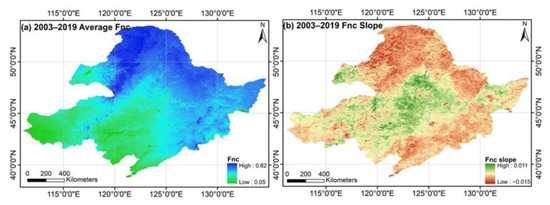 Distribution and change trend of SFnc in Northeast China from 2003 to 2019.