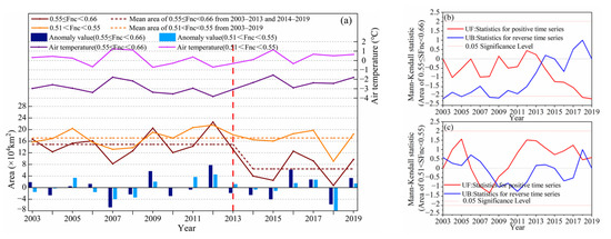 (a) The change curves of area and average MAAT of different thermal states of permafrost in Northeast China from 2003 to 2019. (b) Mann–Kendall test of stable permafrost area. (c) Mann–Kendall test [92] of semi-stable permafrost area.