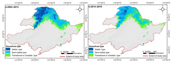 According to the classification standard and time variation characteristics of the thermal state of permafrost, the distribution and change of the thermal state of permafrost is shown in Figure 9. Stable permafrost was mainly distributed in the continuous permafrost region, namely, the GKM, and a small amount in Changbai Mountains and the northern foot of the LKM, with an area of 14.9 × 104 km2 reduced to 6.5 × 104 km2 over the study period; the SFnc was reduced from 0.564 to 0.557. Semi-stable permafrost was mainly distributed at the edge of continuous permafrost area; the island permafrost region, that is, the edge of stable permafrost region in GKM, and most of the region of LKM, with an area of 17.68 × 104 km2, changed to 17.77 × 104 km2, and the SFnc decreased from 0.529 to 0.528. The area and SFnc changed little, but the permafrost distribution region changed significantly. The transitional or unstable permafrost was in the degradation stage and very sensitive to changes of the external environment, and mainly distributed at the edge of the island permafrost region and near the melting region. It also had a relatively high annual average ground temperature, and the annual heat absorption and heat dissipation of soil layer were approximately equal; the permafrost area changed from 8.67 × 104 km2 to 9.56 × 104 km2, and the increased area was due to the thawing of edge regions of permafrost with a higher thermal state, and increasing and expanding of island thawing regions. In addition, it can be seen from Figure 9 that there was no extremely stable permafrost in Northeast China. In terms of spatial distribution, the permafrost showed a regional degradation trend from south to north; the degradation of stable permafrost was characterized by gradual thawing from the edge to the center of the permafrost distribution area and the increase of island thawing area; the degradation of semi-stable permafrost was characterized by the thawing or disappearance of the edge of the permafrost distribution area and the expansion of island thawing area.