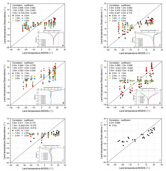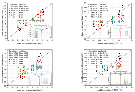 The following results can be drawn from the correlation diagram, and the ground temperature envelope line between the monthly average data of the borehole ground temperature and the monthly value of the LSTc data. The SL4 monitoring site along the Shiwei–Labudalin Highway was a section of seasonal frozen soil (Figure 10a). The monitoring sites GL1 (Figure 10b), GM1 and GM2 (Figure 10c,d) were permafrost sections, respectively, along the Genhe–Labudalin Highway and Genhe–Mangui Provincial Road; the annual heat dissipation of the soil layer in monitoring sites GL1 and GM1 was greater than the heat absorption, the permafrost state was stable; the annual heat dissipation of the soil layer in monitoring site GM2 was equal to the heat absorption, and the permafrost was sensitive to external changes and easily disturbable. The monitoring sites WX5, WX3, WX1 and WX2 (Figure 10e–h) were permafrost sections, located along the Walagan–Zhangling Highway; the annual heat dissipation of the soil layer in monitoring sites WX5 and WX2 was equal to the heat absorption, and the annual heat dissipation of the soil layer in monitoring sites WX3 and WX1 was approximately equal to the heat absorption; all permafrost areas were in the degradation stage, sensitive to external changes and easily disturbable. The monitoring sites BH1 and BH3 (Figure 10i,j) were island permafrost sections in the Bei’an–Heihe section of Jilin–Heihe expressway, and the permafrost was in the degradation stage. The monitoring site BH2 was located in low-lying swamp wetland with perennial ponding, covered with hydrophilous vegetation such as hassock and moss, humus soil and peat soil in the soil layer, which hindered the heat exchange between the soil and air; moreover, the phase change latent heat of water also affected the change of ground temperature [21]. Compared with monitoring site BH3, site BH1 was very close to the edge of the highway and was obviously affected by human activities, therefore, the correlation between the ground temperature data of site BH1 and MODIS LSTC data was slightly low. Taking 0 °C as the basis for judging soil freezing or thawing, we found that the temperature data in the depth range of the active layer have strong correlation, and the correlation coefficient decreased gradually with the increase in depth. In addition, due to the influence of the highway, the data correlation between MODIS LSTC and the monitoring sites close to the highway was relatively low.