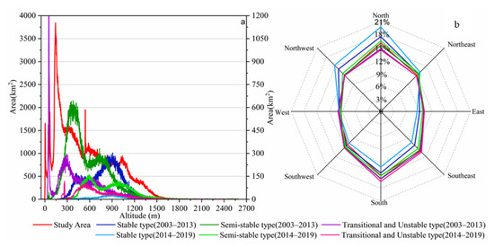 Altitude and slope distribution of different thermal states of permafrost in Northeast China. (a) The altitude of the study area corresponds to the principal coordinate axis, and the altitude of different thermal states of permafrost corresponds to the secondary coordinate axis. (b) Percentage represents the ratio of different slope directions of different thermal states to the total distribution of their slope directions.