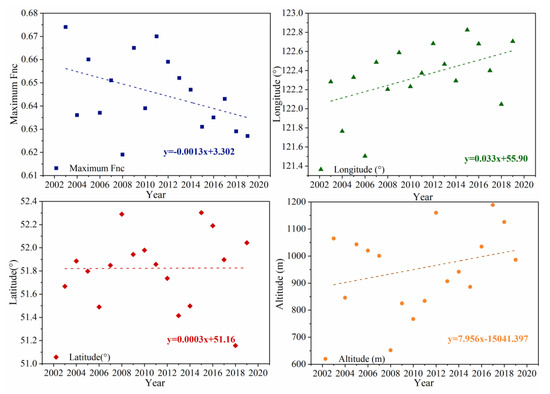 Changes in the thermal state of permafrost are the result of long-term accumulation, which is affected by many factors. Based on SFnc from 2003 to 2019, the variation characteristics of thermal state of permafrost were analyzed, based on the spatial change of the geometric center of the distribution region of SFnc with different percentile intervals (95th–100th percentile). As shown in Figure 13, SFnc showed a decreasing trend, from 0.674 to 0.628; in terms of latitude, the geometric mid-point latitude fluctuated within a range of 0.5° above and below approximately 51.8°N, which was stable permafrost in the study area. The core area of the soil was near 51.8°N, which was not the highest latitude area. From the perspective of longitude and elevation changes, the Fnc extreme point has moved eastward by at least 1°, and the elevation has risen by at least 100 m. Based on the above information, we infer that in the past 20 years, the ratio of heat released to the surface of the study area to absorbed heat has decreased, which may be related to the decrease in the degree of coldness in the cold season.