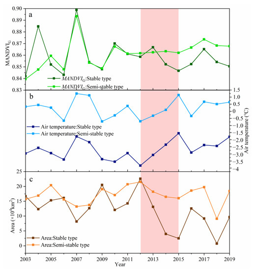 According to the classification standard, we calculated the area of different thermal state types of permafrost from 2003 to 2019. We calculated the average MAAT in stable permafrost regions including Mohe, Tulihe, Erguna and Aershan national meteorological stations, and in semi-stable permafrost regions including Tahe, Sunwu, Aihui, Bei’an, Nenjiang, Xiaoergou, Xinlin and Huma national meteorological stations. The time mutation point of the area of stable permafrost was 2013, and there was no obvious change in the area of semi-stable permafrost (Figure 8b,c). Therefore, the change of thermal state of permafrost in Northeast China was divided into two periods: 2003–2013 and 2014–2019. From 2003 to 2013, the area of stable permafrost changed greatly in 2007, 2009 and 2012, and the distribution area in other years fluctuated slightly, ranging from 12.08 to 16.7 × 104 km2. The average MAAT range in the region was −4~−3 °C, and the correlation coefficient between average MAAT and area was −.81. The increase in MAAT had a significant impact on the change of stable permafrost distribution. The area of stable permafrost from 2014 to 2019 changed greatly, with anomalies in 2016 and 2018, and the area in other years was always lower than the previous period. The average MAAT ranged from −3 to −2 °C, and the correlation coefficient with the area was −0.25. Over seventeen years, the average MAAT increased by nearly 1 °C. In general, the area anomalies of semi-stable permafrost were larger in 2007, 2012 and 2018, and the range of area in other years ranged from 13.8 to 20.8 × 104 km2. The correlation coefficient between area and average MAAT was −0.59.
