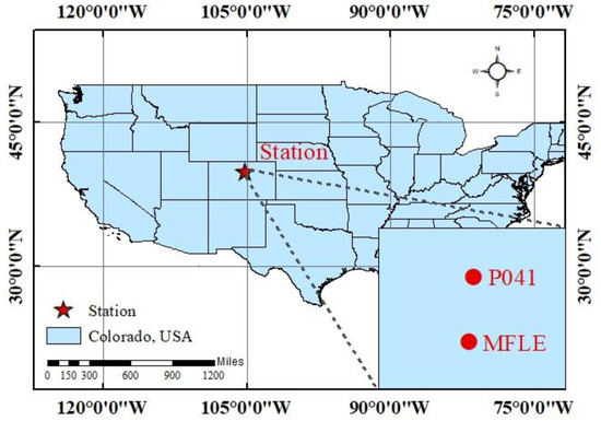 The PBO SMC consisted of the site averaged SMC on a daily timescale, and the median SMC value of all satellite tracks for each day was used [22]. (https://data.unavco.org/archive/gnss/products/) (accessed on 15 September 2021). Located in Colorado, USA, and positioned at an altitude of 1728.8 m, the P041 station (39.9495°N, 105.1943°W). The MFLE station is about 210 m away from the P041 station, its altitude is 1727.3 m, and its position is longitude and latitude (39.9476°N, 105.1944°W). The soil moisture data of the MFLE station is used to further verify this method’s reliability. In view of this, this paper takes P041 station as the research station, MFLE station as the verification station, and MFLE station is very close to P041 station, as shown in Figure 2. The surrounding environment of P041 and MFLE stations are shown in Figure 3 (https://www.unavco.org) (accessed on 25 September 2021). The GNSS receiver and related parameters of the P041 station are shown in Table 1.