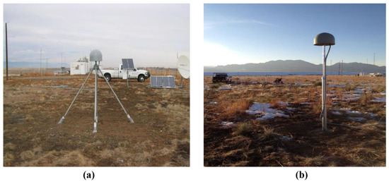 Station conditions: (a) Environment around P041 station; (b) environment around MFLE station. Note: GNSS test site locations: P041 and MFLE, Boulder, CO, USA (https://www.unavco.org) (accessed on 25 September 2021).