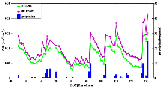 Figure 4 shows the observed SMC and precipitation data series corresponding to the time (DOYs: 45-131,2014) of selecting GNSS observation data from P041 and MFLE stations, which are presented in a line graph and a histogram, respectively. As demonstrated in Figure 4, six significant indigenous precipitation events occurred during the experiment, with a maximum precipitation of 24.8 mm, mainly during DOYs 63–66, 92–93, 102–103, 109–110, 127–128 and 130–131. Continuous precipitation led to a significant nonlinear increase in the SMC. As precipitation decreased or stopped, there was a decrease in the SMC. Evidently, precipitation was the primary factor that caused sudden changes in the SMC. The precipitation at the P041 and MFLE stations during the experimental period was appropriate and suitable for SMC retrieval.