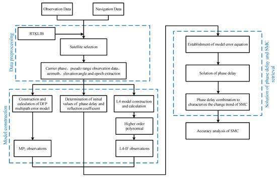 The technical process we followed for multisatellite dual-frequency combined multipath error SMC retrieval. Note: RTKLIB is an open-source program package for standard and precise positioning with GNSS (global navigation satellite system). RTKLIB consists of a portable program library and several APs (application programs) utilizing the library (http://www.rtklib.com/) (accessed on 10 February 2022).