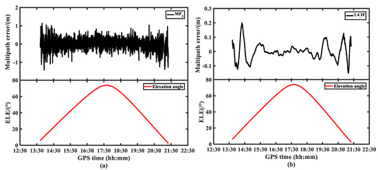 The multipath error varies with satellite elevation angle: (a) dual-frequency pseudorange multipath error; (b) dual-frequency carrier phase linear combination of multipath errors.