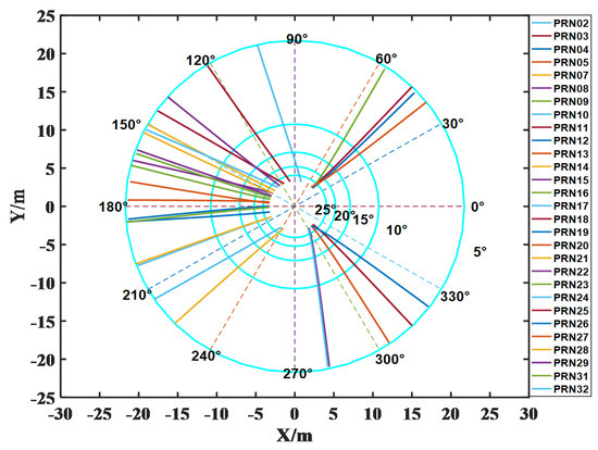 The least-squares adjustment method is used to solve the delay phase. The L4_IF method is taken as an example to illustrate the solving process of the phase delay. For the 11 multipath errors of one observation session for a single GPS satellite, 11 error equations, such as Equation (20), can be obtained. Then, these error equations can be expressed by the following matrix: