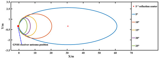 Figure 10 shows the first Fresnel reflection region ellipse group of the GPS L2 carrier when the satellite azimuth was 0°, the satellite elevation was 5–25°, and the receiver antenna height was 1.9 m. The horizontal axis represents the distance from the receiver antenna to the direction of the satellite, and the vertical axis represents the distance perpendicular to the direction of the receiver antenna and satellite. When the satellite elevation angle increases, the Fresnel reflection region shrinks, and the reflection center is closer to the GNSS receiver. The area of the ellipse can be obtained from the semimajor and semiminor axes of the ellipse, that is, the area of the first Fresnel reflection region. Using the first Fresnel reflection region can avoid the influence of other multipath sources, such as tall buildings, vegetation, and water; maximize the unity of the reflection medium in the reflection zone; and be used for the design of the experimental plan. Therefore, the Fresnel reflection region provides a certain basis for determining the location of soil moisture sample collection points and selecting effective satellites. The change in the reflection medium in the Fresnel reflection region considerably affects the signal received by the receiver.