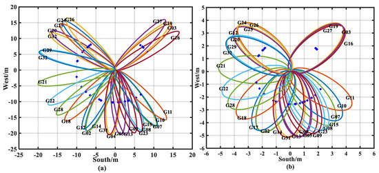 First Fresnel reflection region map of station P041 (DOY: 2014-065): GPS satellite distribution in the first Fresnel reflection region of station P041 when satellite elevation angle was (a) 10°; (b) 25°.