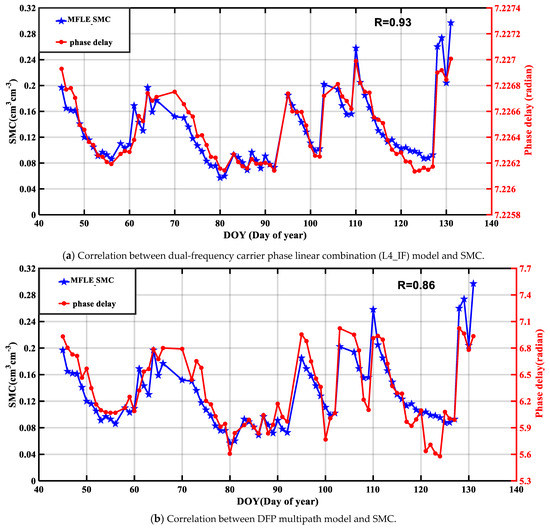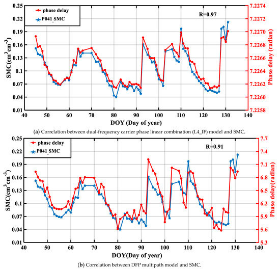 Combining the results of daily satellite selection, for the selected single satellite, we calculated the multipath error according to the dual-frequency signal of 11 epochs before and after the corresponding time. Combining the above principles and methods, we obtained the delay phase corresponding to the time of soil moisture acquisition through adjustment. Therefore, one phase delay could be calculated for each observation period, and 12 phase delays could be calculated for 12 observation periods in a day. By averaging the 12 results, we obtained the average phase delay, which is the daily phase delay. On a daily time scale, the L4_IF method and the DFP method were calculated separately to obtain the corresponding daily phase delay, and Time trends of soil moisture and delayed phase at P041 and MFLE stations were plotted (Figure 13a,b and Figure 14a,b).