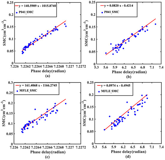To further test the L4_IF method and the DFP method, 50 d of the P041 and MFLE SMC, respectively, and the estimated phase delay were employed to build an empirical model, and the other 28 d of data were used to verify the model. The modelling method employed was unary linear. In the relationship between soil moisture and phase delay, in this study, we used the phase delay as the independent variable (x) and the soil moisture as the dependent variable (y) to perform univariate linear regression modeling. We obtained the scatter plot and regression shown in Figure 15.