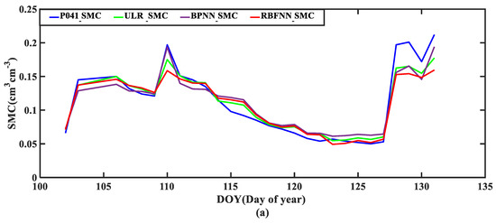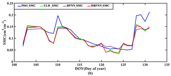 Table 4 shows that for the L4_IF and DFP methods of P041 and MFLE stations, the prediction results of the BPNN model are better than the RBFNN model and ULR model, and the RBFNN model is slightly better than the ULR model. The reasons may be as follows. Firstly, soil moisture is affected by vegetation cover, soil temperature, air humidity and other factors, and multipath reflection is not an imaginary mirror reflection, which makes it difficult to characterize other nonlinear characteristics between delay phase and soil moisture by using simple linear or exponential models. Secondly, the BPNN algorithm can correct the dielectric constant difference caused by weakening soil roughness, and has a certain inhibitory effect on surface fluctuation, soil roughness and vegetation.