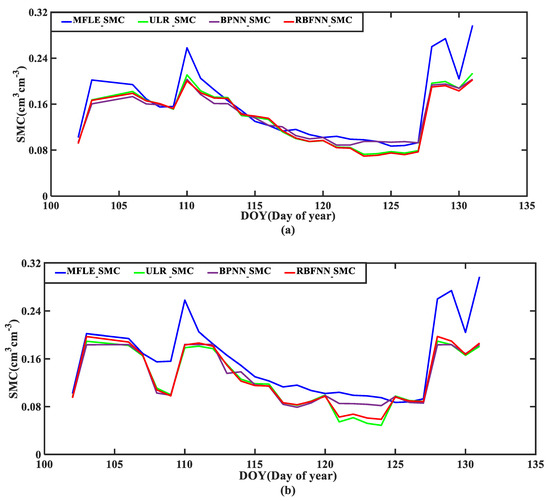 For the MFLE station, comparison between predicted values of three models and measured values of soil moisture (a) the L4_IF method; (b) the DFP multipath model. Note: The P041_SMC in Figure 16a,b are SMC value of the P041 station; the MFLE_SMC in Figure 17a,b are SMC values of the MFLE station; the ULR_SMC in Figure 16 and Figure 17 are unitary linearity regression model predictive value; the BPNN_SMC in Figure 16 and Figure 17 are back propagation neural network model predictive value; the RBFNN_SMC in Figure 16 and Figure 17 are radial basis function neural network model predictive value.