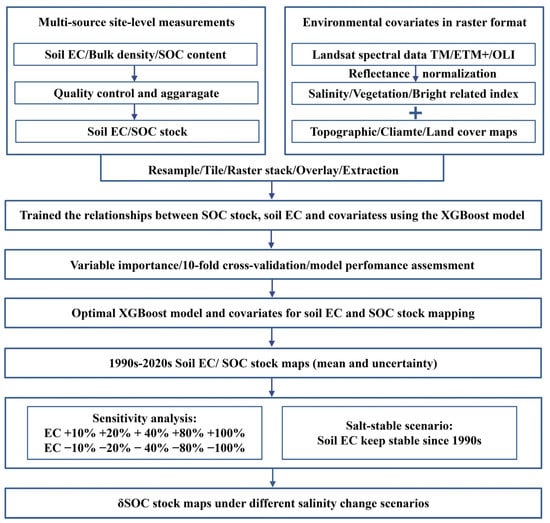 Soils store about 1500 Pg (1 Pg = 1015 g) organic carbon in the first meter, which is almost double that in the atmosphere and three times that in the above-ground biomass [1]. As a fundamental component of the terrestrial ecosystem carbon cycle, soil organic carbon (SOC) plays an important role in the global carbon budget and exhibits a marked response to climate warming and anthropogenic activities [2,3,4]. In addition, SOC is closely linked to most ecosystem services, including soil structure and fertility improvement, food and fiber supply, soil and water retention, and cultural and scientific benefits [5,6,7]. Thus, monitoring and modeling of the spatial distribution and dynamics of SOC stock are currently a global focus attracting attention from researchers, policy makers, and socioeconomists for the purpose of carbon neutrality, food security, and carbon trading in the next decades [8,9,10,11]. SOC stock is essentially determined by the long-term balance between carbon inputs and mineralization as affected by vegetative, pedological, and biochemical processes, which are closely related to climate change and anthropogenic activities [3,7]. Of these biotic and abiotic influencing factors, soil salinization is closely related to land degradation and supposed to exert a significant effect on SOC dynamics [12,13]. However, our understanding of the role of soil salinization in shaping the spatio-temporal patterns of SOC stock in a broad scale (>104 km2) remains limited.