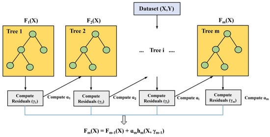 Brief illustration on how gradient tree boosting works. Note: αi and γi are the regularization parameters and residual computed with the ith tree, respectively, and hi is a function that is trained to predict residuals, γi using X for the ith tree. To obtain αi, we employed the residuals computed, γi and computed the following: , where L(Y, F(X)) is a differentiable loss function.
