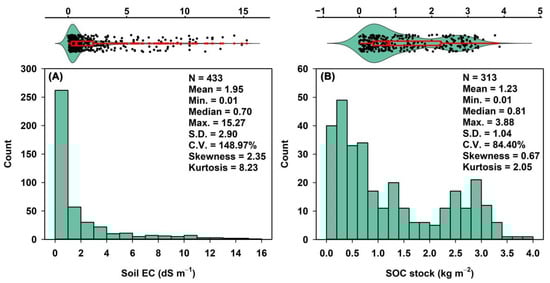 Histogram and statistics of soil EC (A) and SOC stock (B). Note: N, Min, Max, S.D., and C.V. represent the sample size, minimum, maximum, standard deviation, and coefficient of variation, respectively.