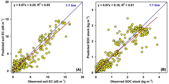 Comparison between observations and predictions for soil EC (A) and SOC stock (B) based on 30 runs of the 10-fold cross-validation procedures.
