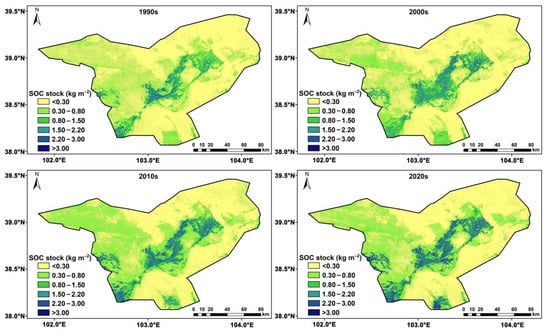 Spatial patterns of SOC stock at 0–20 cm estimated based on 30 runs of the XGBoost models for the 1990s, 2000s, 2010s, and 2020s. Note: SOC stock was mapped at a resolution of 30 m.