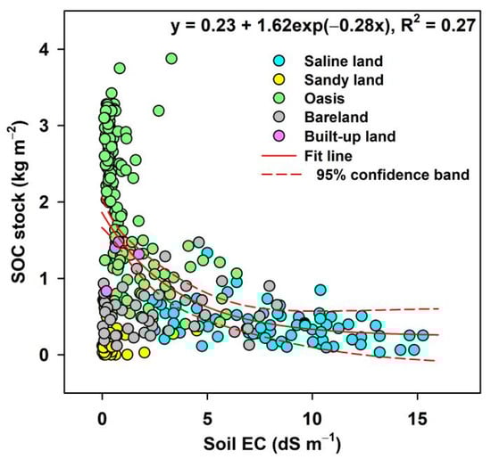 The soil carbon–salinity relationship, based on site-level measurements, showed that SOC sock decreased significantly with increasing soil EC following an exponential function, with an R2 value of 0.27 (Figure 8). Similar results were also obtained by previous studies conducted in other salt-affected regions [13,68]. Generally, SOC stock in saline soils is affected by two contrary processes: reduced plant inputs and lowered decomposition rates [12]. On the one hand, salinity stress directly reduces plant water uptake and deteriorates transpiration, resulting in a reduction in carbon inputs into soils. On the other hand, it also decreases microbial activities and the rates of organic matter decomposition, leading to an increase in SOC stock if the carbon inputs are unchanged [14,66]. In most cases, the negative effect of soil salinity on SOC stock is much larger than the positive effect, especially in agroecosystems [19,40]. In this study, we found that the negative relationship between SOC stock and soil EC was mainly contributed by data points from oasis while SOC stock in bare land varied less with soil EC. This result confirmed that salinity was a regulatory factor that exerted an additional effect on SOC stock only when the water availability was guaranteed for the arid ecosystems. In cultivated oasis, the vegetation-soil system was well irrigated, and salinity could exhibit an effect on carbon cycling by significantly altering the microbial activity and plant growth processes. In contrast, in the bare land of arid inland regions, the carbon cycling-associated biotic processes were trivial due to the extreme shortage of water resources, and the variation of the salinity could exert lesser effects on SOC stock. Surprisingly, we also found that SOC stock in sandy land seemed to exhibit a slightly increasing trend with increasing soil EC. We deduced that this was probably associated with the effect of soil texture. In sandy regions, soils with a greater salt content were generally characterized by finer soil particulates, which were originally derived from river and lake deposits containing more old carbon in comparison with coarse sand particles [14,39]. Nevertheless, the SOC stock in the study area showed a significantly negative relationship with soil salinity at the basin scale.