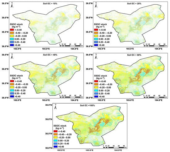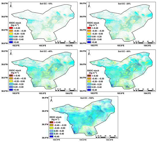 We found that SOC sock decreased significantly with increasing soil EC, and their relationship could be expressed as an exponential decay function, i.e., y = 0.23 + 1.62exp(−0.28x), with the R2 value reaching 0.27 (Figure 8). We also found that the decreasing trend was mainly contributed by data points from oasis, and SOC stock in bare land was less varied with soil EC. In addition, SOC stock in sandy lands seemed to exhibit a slightly increasing trend with increasing soil EC. Salinity sensitivity analysis showed that the responses of SOC stock to salinity variations exhibited strong spatial heterogeneity. A reduction in soil EC led to an SOC stock increase in most parts of the study area, and the higher the decrease in soil EC, the larger the values for SOC stock (Figure 9, Figure 10 and Figure 11). In contrast, the increase in soil EC will significantly decrease SOC stock. The area-weighted mean SOC stock was estimated to change by 0.040 and −0.025 kg m−2 if soil salinity varied by −100% and 100%, respectively, with marked changes occurring in oasis areas (Table 3). In addition, a reduction in salinity over the past three decades was estimated to enhance SOC stock by 0.015 kg m−2, and this amount was about 10% of the total SOC stock increase (Figure 12). δSOC stock in oasis (94.24 g m−2) exhibited a stronger response to salinity change than in saline (23.34 g m−2), sandy (6.03 g m−2), and bare land (−3.43 g m−2) (Table 4).