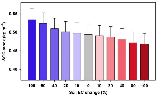 To separate the effect of salinity on SOC stock from that of other environmental controls such as vegetation and climate, we conducted a sensitivity experiment by only altering the values of soil EC while keeping other environmental covariates constant. A salinity sensitivity analysis for SOC stock could enable us to quantitatively evaluate the size and direction of SOC stock change in response to soil salinization over space and time. We applied SOC stock, soil EC, and other environmental covariates data of the 2010s to define baseline conditions, and another 10 soil EC change scenarios (from −100%, −80%, −40%, −20%, −10%, +10%, +20%, +40%, +80% to +100%) were set for SOC stock prediction.