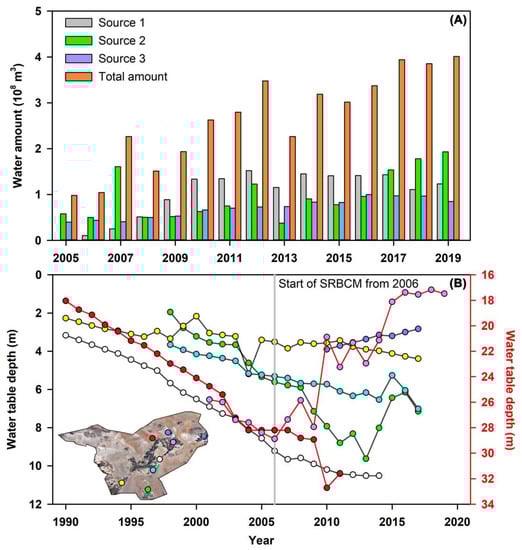 Variation in the total water amount in the lower reaches since 2005 (A) and annual water table depth since 1990 (B). Note: SRBCM is the Shiyang River Basin Comprehensive Management, which started in 2006 in order to restore the rapidly degrading natural ecosystems due to groundwater overdraft. The SRBCM relieved the water shortage problem in the lower reaches mainly by enhancing the direct water transfer amount from the Xiying Reservoir at the upper reaches of the Shiyang River (Source 1), the inter-basin water transfer amount from the Yellow River based on the Jingtaichuan Pumping Irrigation Engineering Project (Source 2), and the runoff in natural river course (Sources 3).