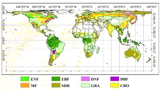 This study used the global MODIS International Geosphere-Biosphere Projects (IGBP) majority land-cover classification at 0.5° × 0.5° to identify global vegetated areas and vegetation classes (Figure 1). We reclassified the plant function types into eight categories: evergreen needle-leaf forest (ENF), evergreen broad-leaf forest (EBF), deciduous needle-leaf forest (DNF), deciduous broad-leaf forest (DBF), mixed forest (MF), grassland (GRA), cropland (CRO), and shrub (SHR).