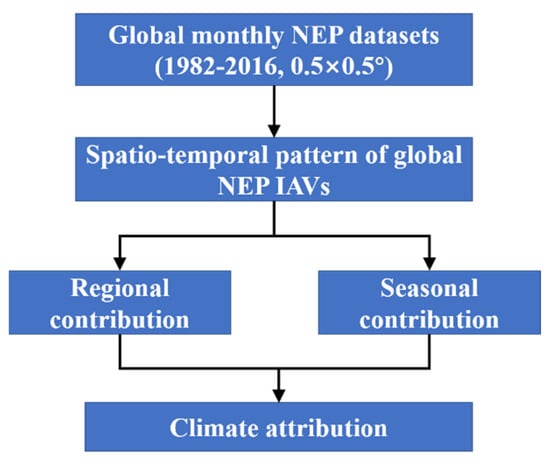 Increased atmospheric CO2 concentration since 1850 has enhanced plant growth, and global terrestrial ecosystems have functioned as a strong carbon sink since the 1960s [1]. On average, the global terrestrial ecosystem could remove around a quarter of anthropogenic CO2 emissions per year, substantially mitigating global climate change [2]. As the difference between gross primary production (GPP) and ecosystem respiration (Re), net ecosystem production (NEP) represents net carbon uptake by terrestrial ecosystems. Thus, positive NEP indicates that the terrestrial ecosystem is a carbon sink, while negative NEP means it is a carbon source [3]. The interannual variability (IAV) in NEP reflects year-to-year variations in ecosystem carbon budgets, which determine the strength of the carbon sink or source [4,5]. Hence, the IAV of NEP plays a critical role in regulating the global carbon cycle [6,7,8].