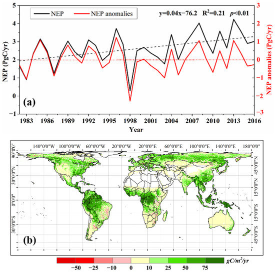 Our estimated NEP showed an increasing trend from 1982 to 2016, which was also illustrated by previous studies [9,30]. Large interannual variability was found from 1982 to 2016, with the largest negative NEP anomaly being −2.32 Pg C in 1998 when the Northern Hemisphere suffered a widespread drought [31]. Furthermore, the largest positive NEP occurred in 2013, with a NEP anomaly of 1.62 Pg C when the climate condition was suitable for plant growth [28].